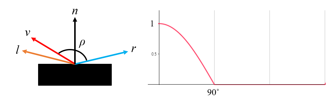 ρ 가 반사벡터 r과 view 벡터 v 사이의 각도를 의미한다고 하자.