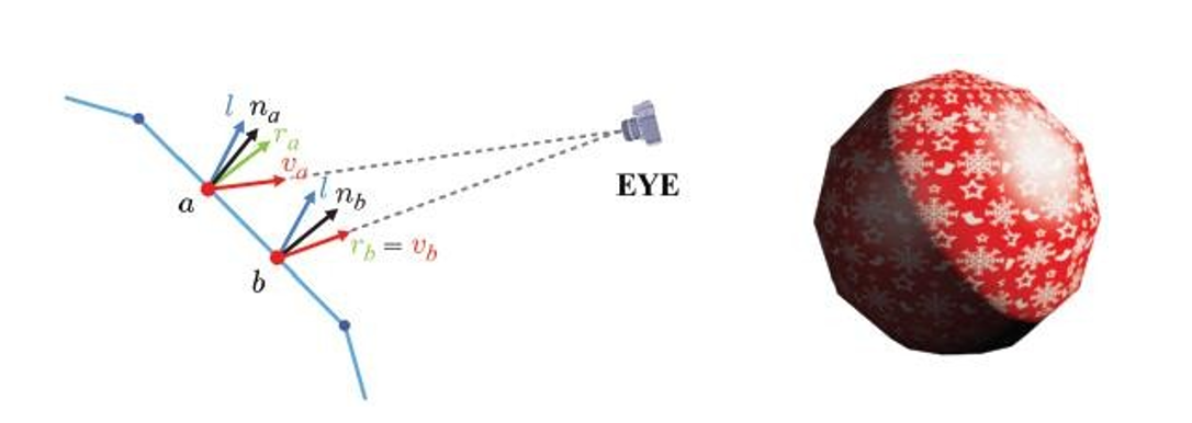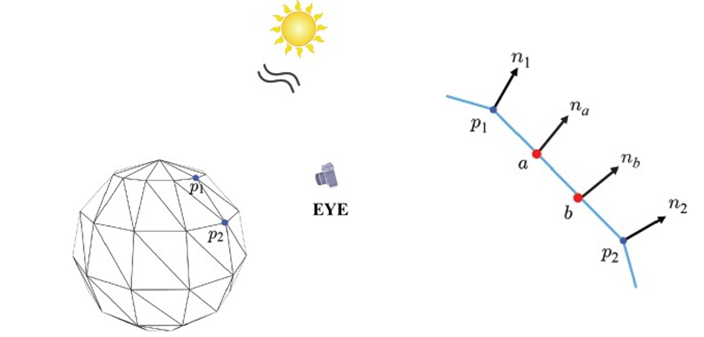 vertex normal인 n_1과 n_2를 보간해서 pixel normal n_a와 n_b를 각각 만들어줌!