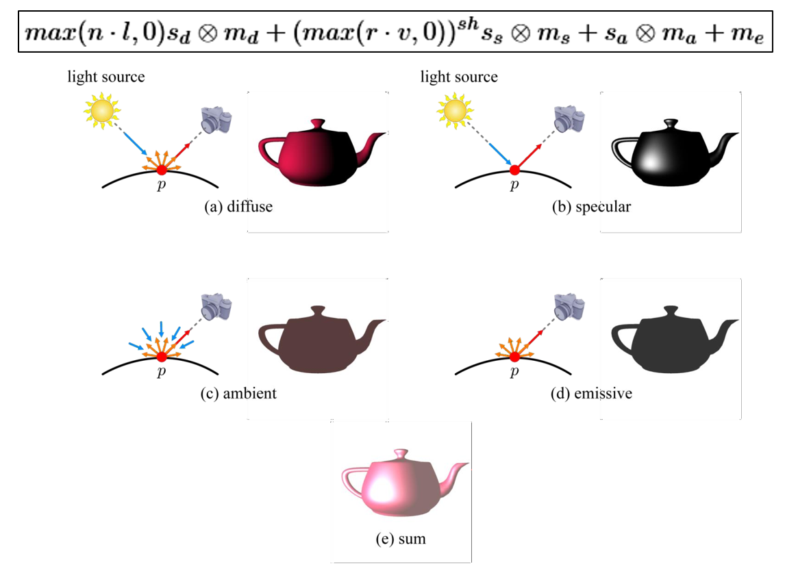 아래 식의 term 하나하나가 각각 diffuse, specular, ambient, emissive 의미. 다 더한거 ㅇㅇ