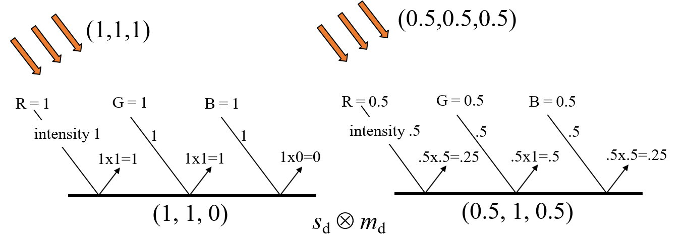 빛이 어떤 메쉬에 도달했을 때 어떻게 내 눈에 들어올지 정확히 계산은 못하지만, 몇 가지 작용이 섞여있을거야.