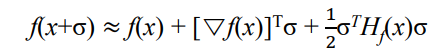 어떤 f(x)를 σ만큼 이동시킨 f(x+σ)는, f(x) + transpose(gradient f(x))σ + (1/2)transpose(σ)Hessian(f(x))σ와 같다.