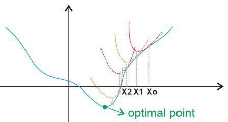 2차 함수의 최소값 위치를 기준으로 θn+1을 업데이트해나감.
