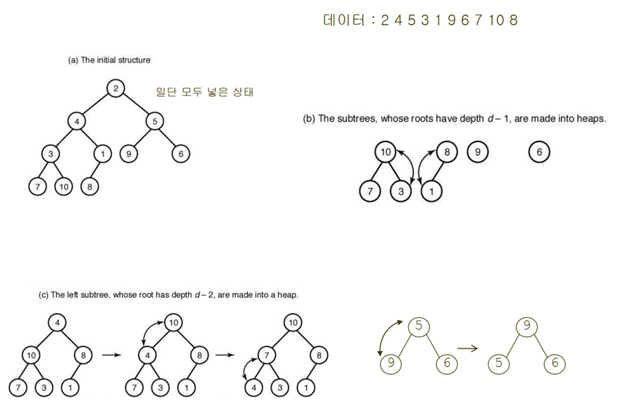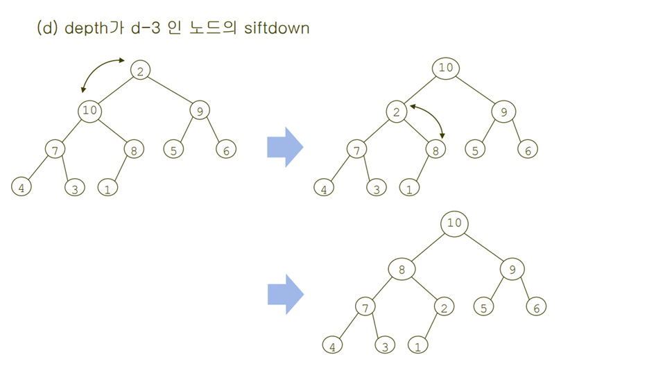 일단 전부 트리에 넣음. 깊이가 d-1 노드들을 root로 생각해서 siftdown하고, 그다음엔 깊이가 d-2, d-3, ... 0인 노드들을 root로 생각해서 siftdown. (그 노드가 루트일 때 아래의 노드들은 다 힙 완성!) depth가 d-n인 노드의 경우, 최대 n번까지 밑으로 내려갈 수 있음.