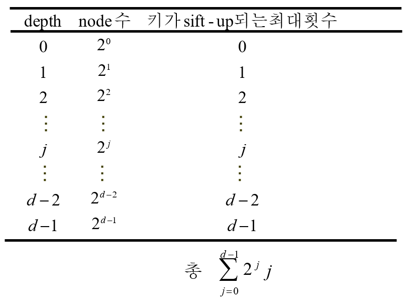 분석을 위해, 일단 깊이가 d인 그 마디가 없다고 가정하고 키가 sift-up되는 상한값(upper bound)을 구한 후에, 깊이가 d인 마디의 키가 sift-up되는 상한값을 더해주자.