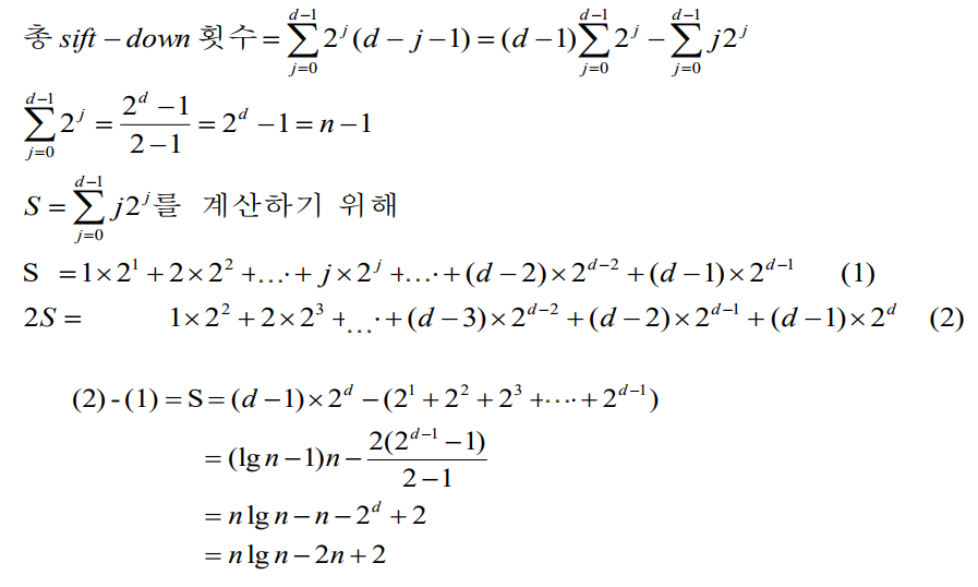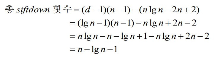 그럼 depth = d인 노드를 포함했을 때 총 sift down 횟수를 구해보자. n - lg n - 1 + lg n = n-1