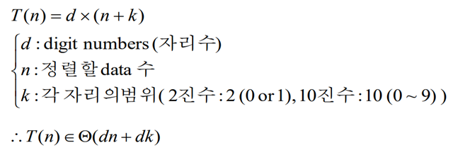 단위연산: 뭉치에 수를 추가하는 연산 입력크기: 정렬하는 정수의 개수 = n, 각 정수를 이루는 디지트의 최대 개수(몇 자리수) = numdigits