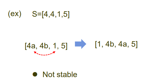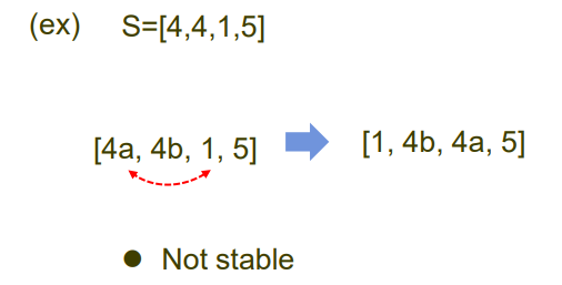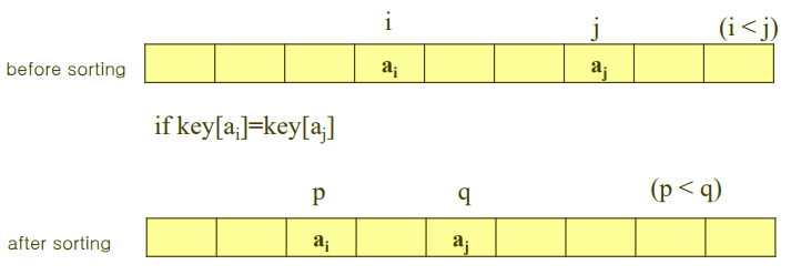 그림에서 ai와 aj는 정렬 후에도 상대적인 대소관계가 같다. 이러한 성질을 갖는 정렬방법은 stable 하다고 한다. ✓ stable: insertion sort, merge sort, bubble sort - 추가적인 구현으로 stable하게 만들 수 있다. ✓ notstable: quick sort, heap sort, selection sort, exchange sort