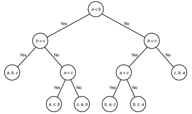 ✓ 3개의 키 a,b,c 를 정렬하는 알고리즘의 결정트리(decision tree).