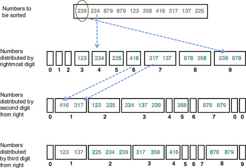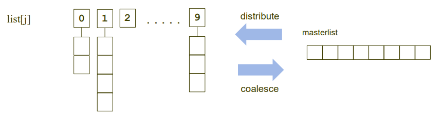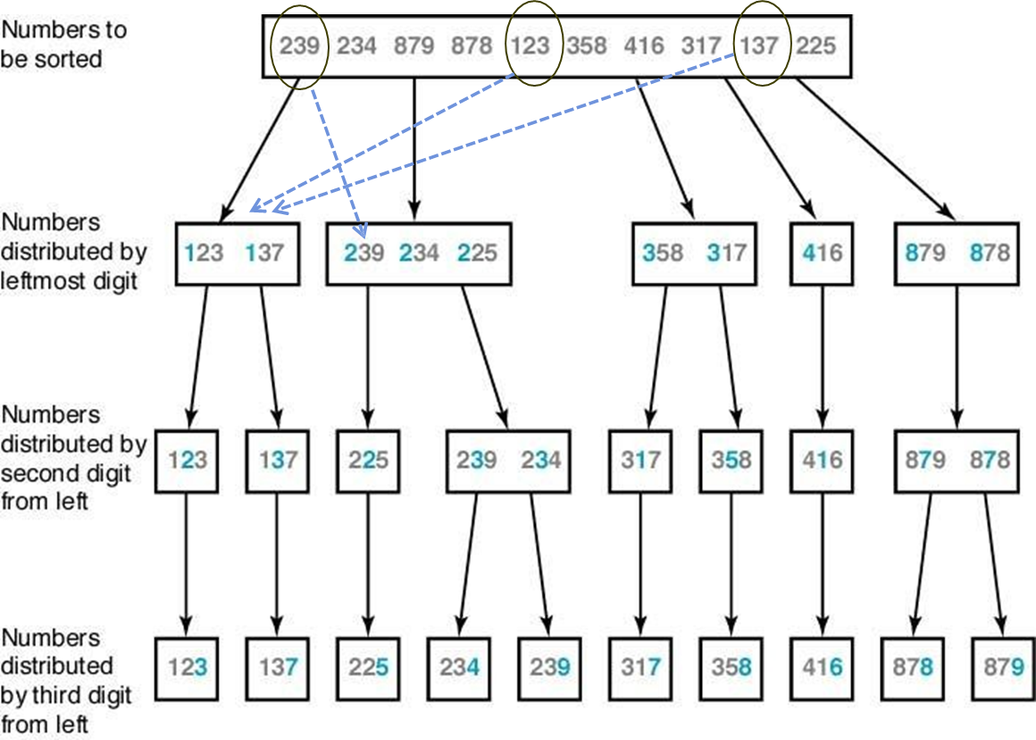 linked list로 구현. 1의 자리부터 올라가며 한 자리씩 sort. 만약 100의자리 숫자인 경우, 100의자리와 10의자리는 같고 1의자리가 다른 두 수에 대해서 상대적인 위치가 정렬된대로 유지됨. 이런 느낌의 아이디어를 이용한 정렬.