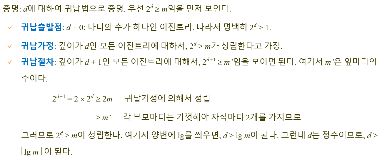 leaf 노드 수가 m이고, 깊이가 d이면 d >= ┌lg m┐ (lg m의 상한)이다.