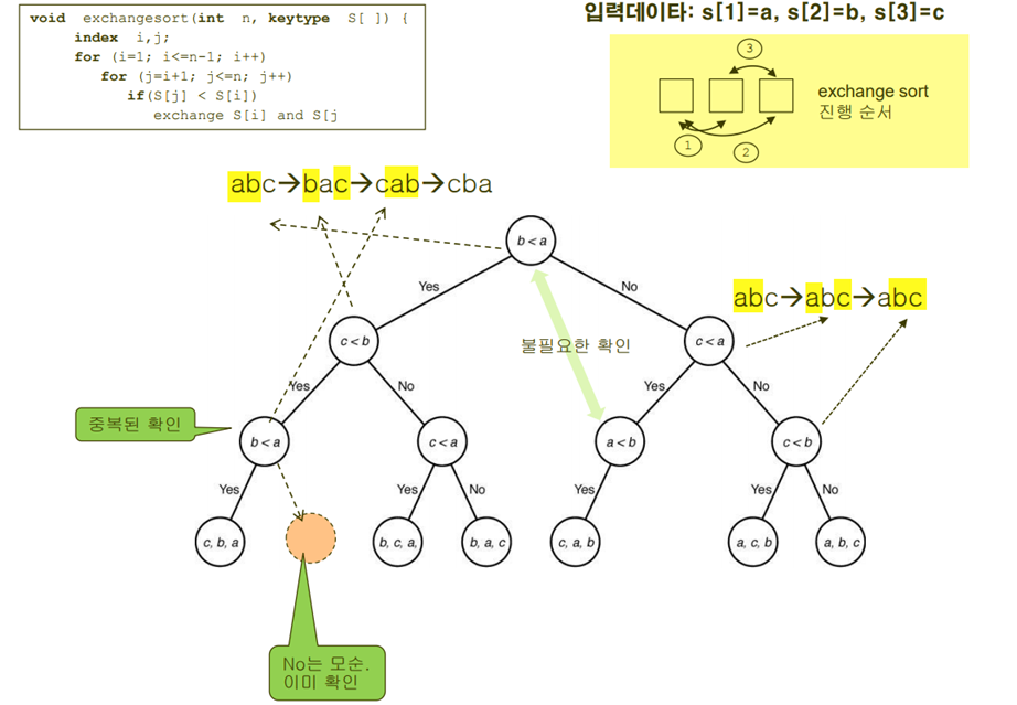 그림과 같이, 이미 비교했었던 b<a를 후에 다시 비교하는 것을 알 수 있다. 즉 교환 정렬에서는 불필요한 비교가 일어남!! 주황색 부분의 경우 일어날 수 없으므로 가지침.