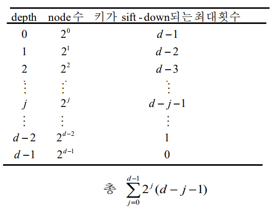 ✓단위연산: sift-down 함수에서의 키의 비교 ✓입력크기: 총 키의 개수 n. (n = 2^k라 가정) ✓ d를 실질적인 완전이진트리의 깊이라고 하면, d = lg n. 위 트리에서, d의 깊이를 가진 마디는 정확히 하나이고 그 마디는 d개의 조상(ancestor)을 가진다.