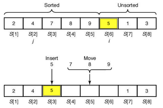 (왼쪽에서)두번째 i부터 시작. (첫번째는 j 줘야함) j가 i-1에서 1까지 이동할 때, S[j]가 S[i]보다 크다면 (작아질 때까지) S[j]를 오른쪽으로 한칸씩 밀어줌. (x = S[i] 저장) S[j]가S[i]보다 작은 곳에 도달했다면 S[j+1]에다 S[i]를 넣어주면서 조금씩 정렬되어감.
