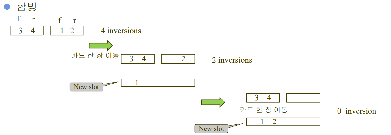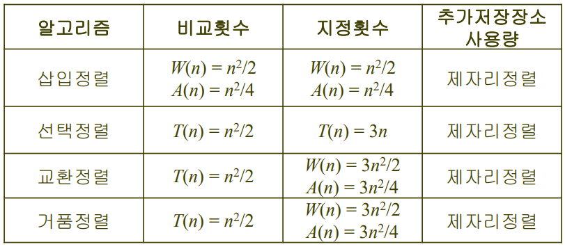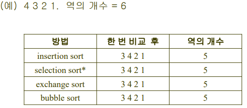 제자리 정렬(in-place sort): 정렬을 위해 추가적으로 소요하는 저장장소가 상수인 경우