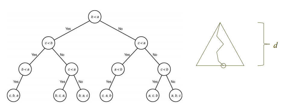 결정 트리에 의해서 수행된 최악의 경우 비교 횟수는 그 tree의 depth와 동일하다. 위 그림에서 root가 d=3인 leaf로 가려면 3번 비교해야 함.